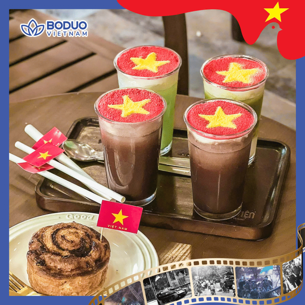 Sử dụng những nguyên liệu đặc trưng từ mứt và siro Boduo, bộ 03 công thức này được thiết kế để tạo ra hiệu ứng thị giác mạnh mẽ với sắc đỏ – vàng chủ đạo, màu của lá cờ, màu của sự nhiệt huyết.