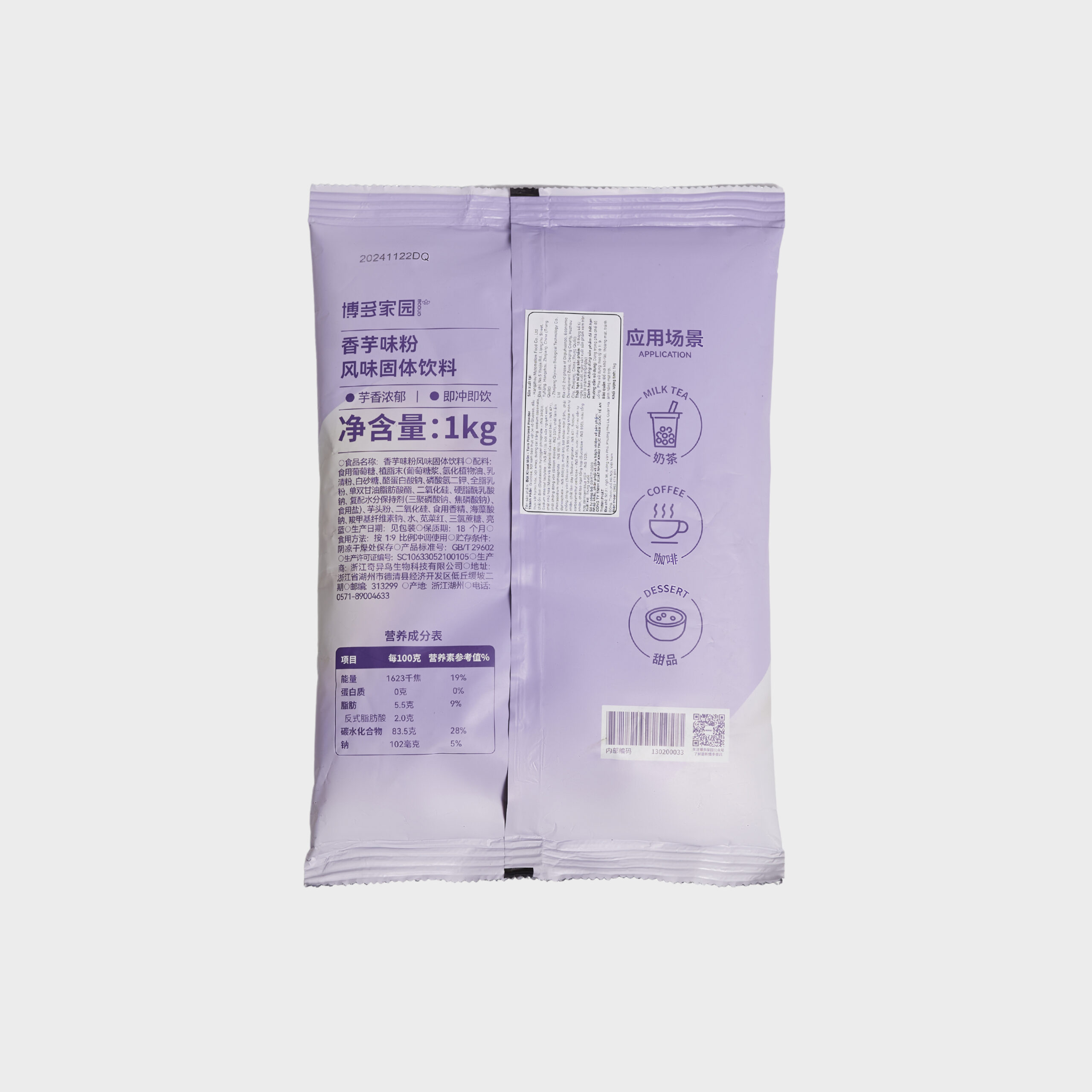 Glucose, bột kem béo thực vật (xi-rô Glucose, dầu thực vật hydro hóa, bột whey, đường cát trắng, sodium caseinate, chất ổn định (Dipotassium hydrogen phosphate – INS 340(ii), Sodium stearoyl lactylate – INS 481(i)), bột sữa nguyên kem, chất nhũ hóa (Mono và diglycerid của các acid béo – INS 471), chất chống đông vón (Silicon dioxide – INS 551), chất làm ẩm (Pentasodium triphosphate – INS 451(i), Tetrasodium diphosphate – INS 450(iii)), muối ăn), bột khoai môn 2,9%, chất chống đông vón (Silicon dioxide – INS 551), hương khoai môn tự nhiên, chất làm dày (Sodium alginate – INS 401, Sodium carboxymethyl cellulose – INS 466), nước, màu đỏ rau dền tự nhiên, chất tạo ngọt tổng hợp (Sucralose – INS 955), màu tổng hợp (Brilliant blue FCF – INS 133).
