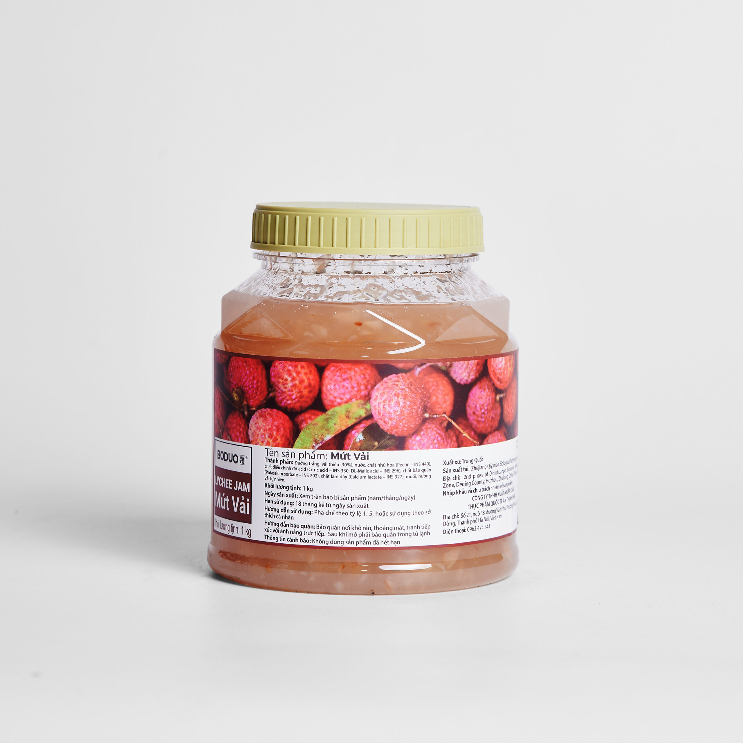 Đường trắng, vải thiều (30%), nước, chất nhũ hóa (Pectin – INS 440), chất điều chỉnh độ acid (Citric acid – INS 330, DL-Malic acid – INS 296), chất bảo quản (Potassium sorbate – INS 202), chất làm dày (Calcium lactate – INS 327), muối, hương vải tự nhiên.