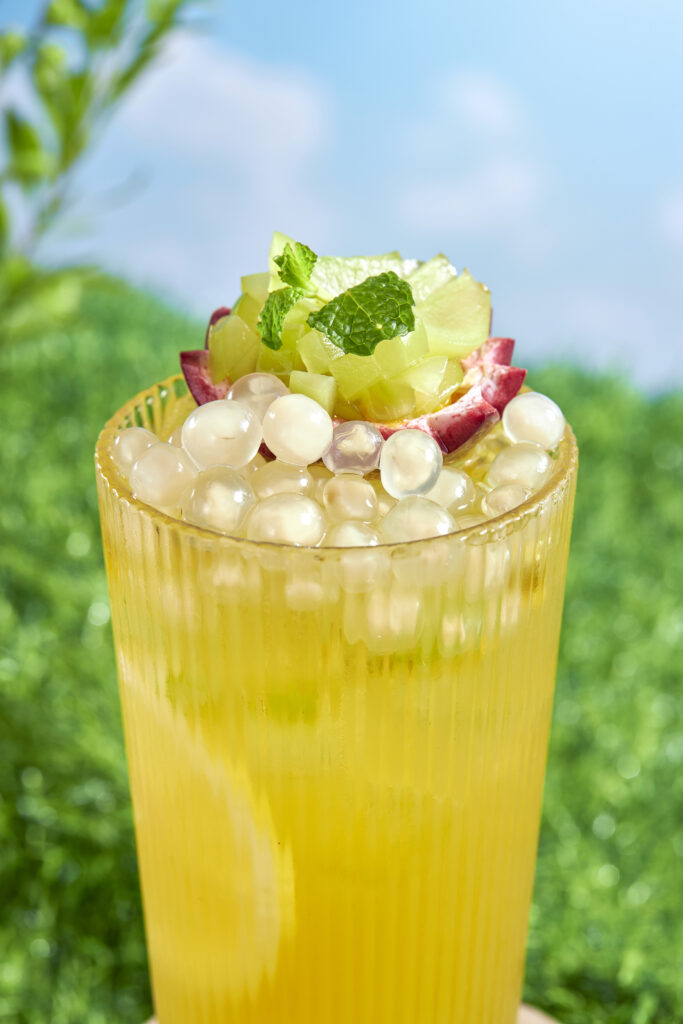 Hạt nổ củ năng mang đến cảm giác giòn sần sật, vui miệng, giúp mỗi ngụm trà hoa quả trở nên thú vị hơn.
